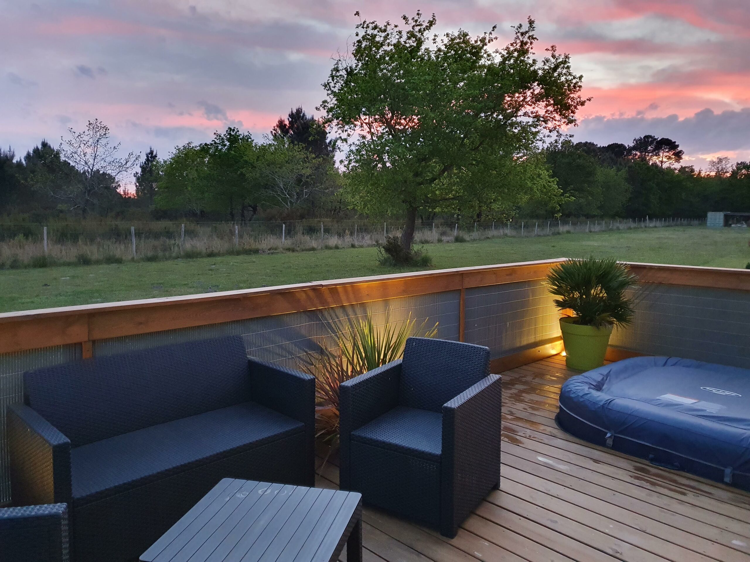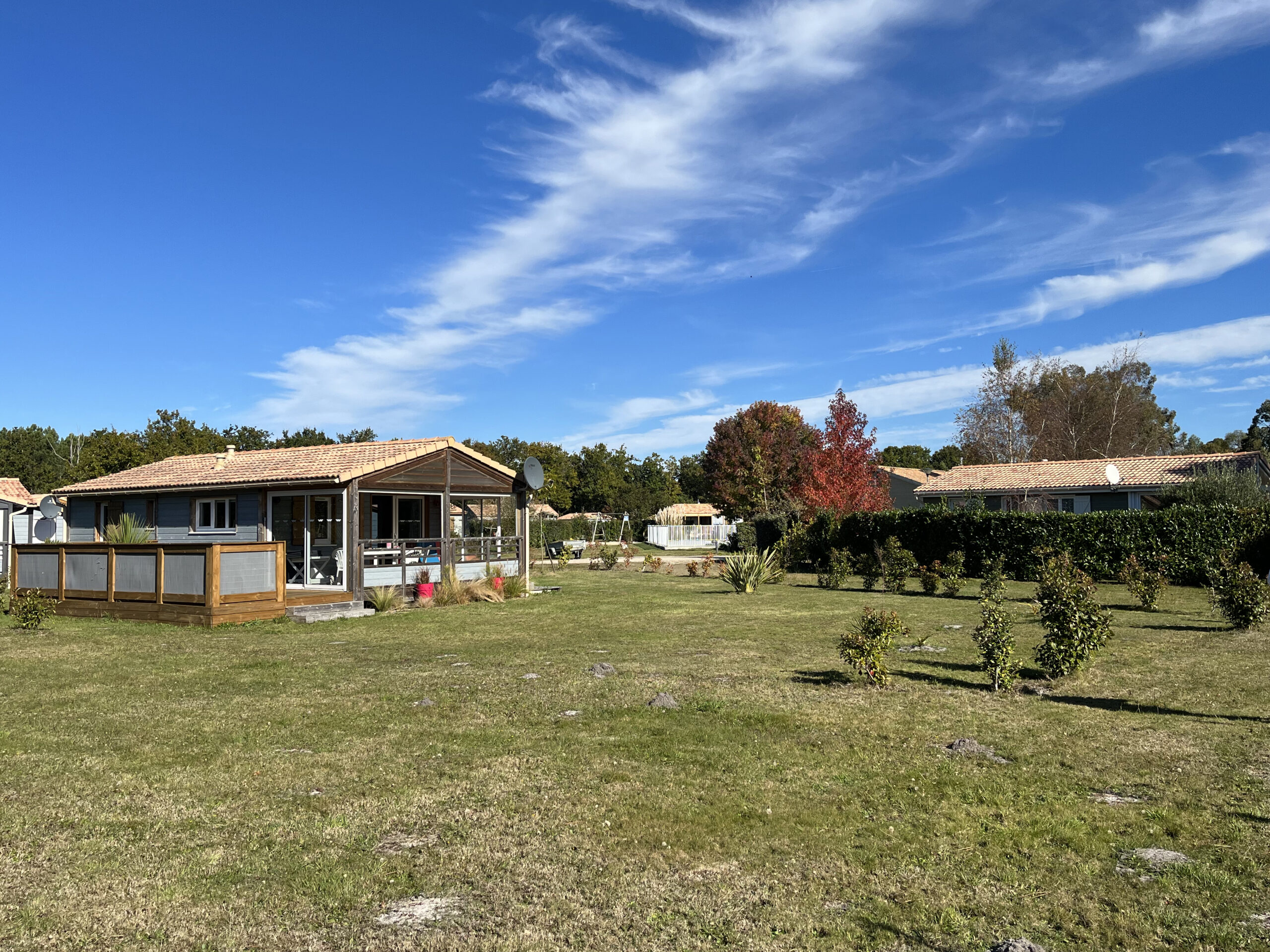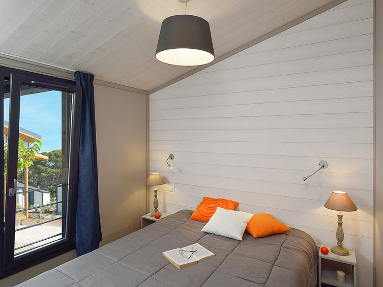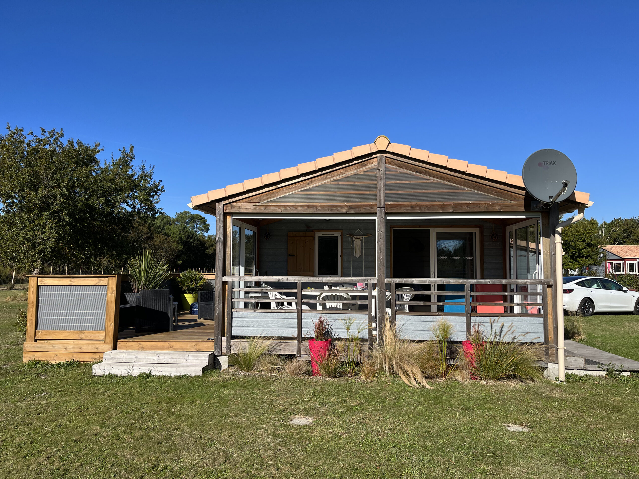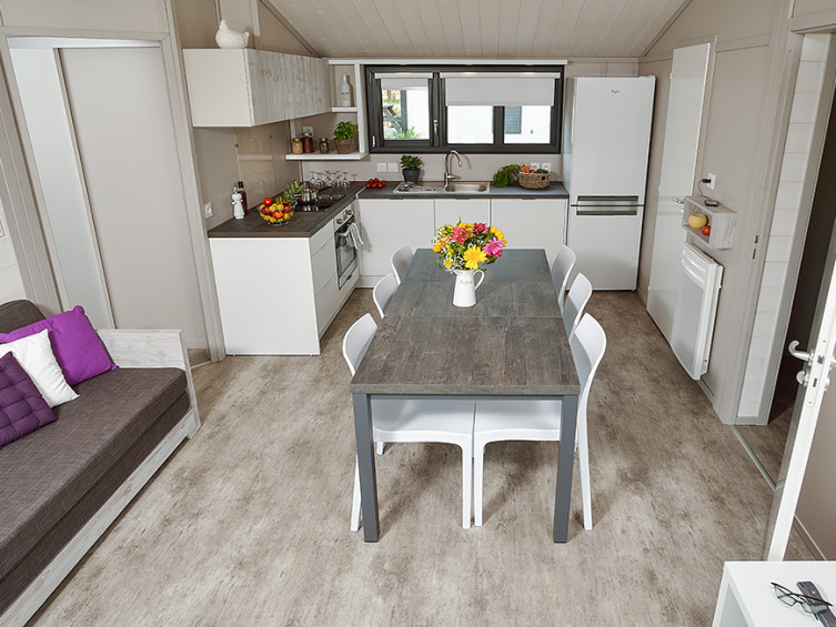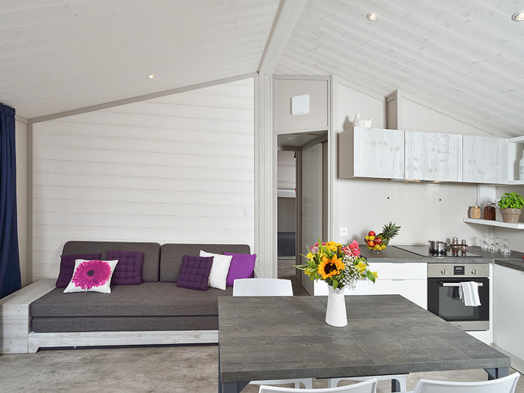 Sur un terrain de 480 m², ce chalet de 35 m² avec terrasse couverte de 20 m², solarium et SPA peut accueillir jusqu’à 5 personnes.