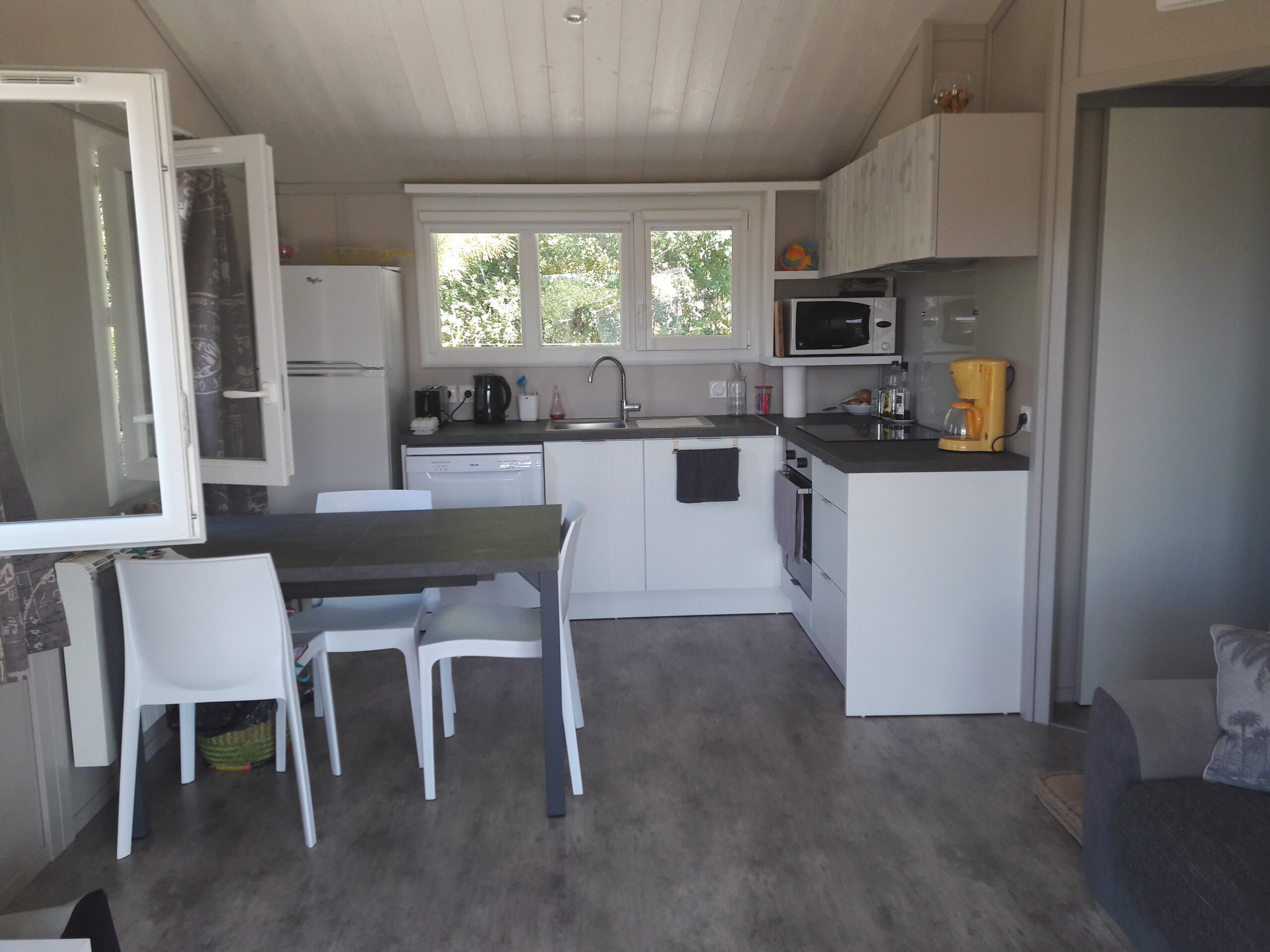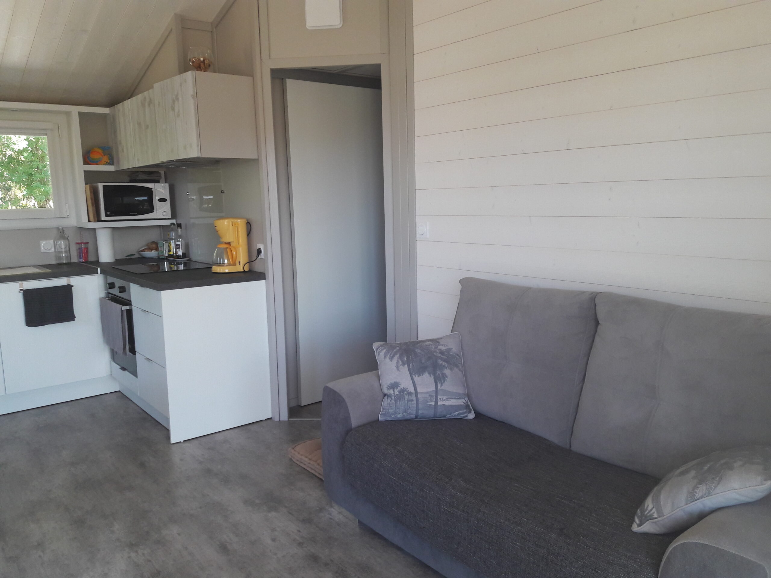 - 1 pièce à vivre avec une cuisine équipée et un coin séjour avec canapé et TV